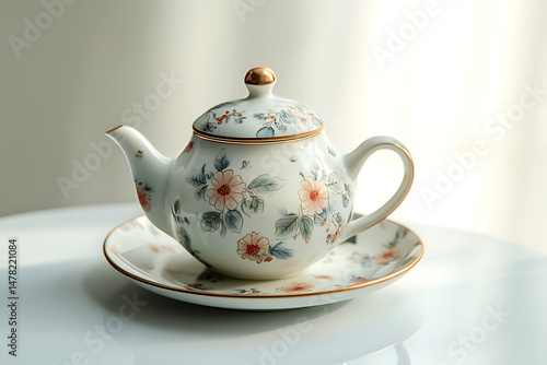 Elegant floral teapot and saucer on a bright table with soft natural light filtering through curtains