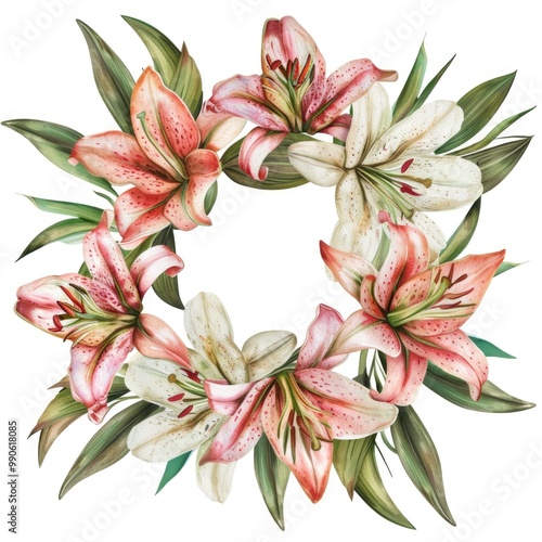Elegant Floral Wreath of Vibrant Pink and Red Lilies on White Background