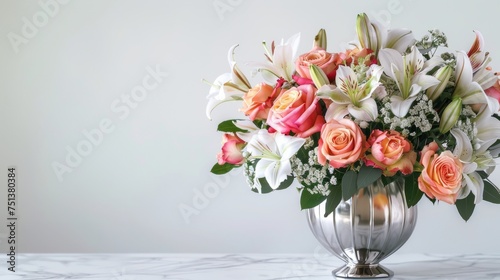 Elegant flower arrangement in silver vase on marble surface. Beautiful bouquet with roses and lilies. Sophisticated floral decor for luxury event.