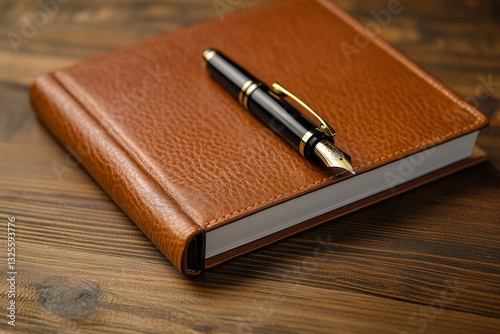 Elegant fountain pen on leather journal on wooden desk