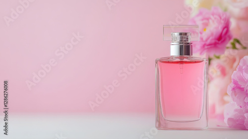Elegant fragrance bottle with soft focus floral background, Perfect for product mockup and display.