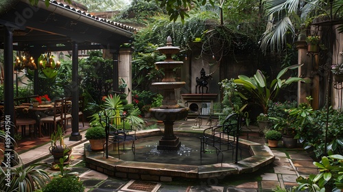 Elegant garden with a beautifully set open-air dining area captured taking inspiration from rustic aesthetics, enhanced by striking greenery and chic outdoor furniture.