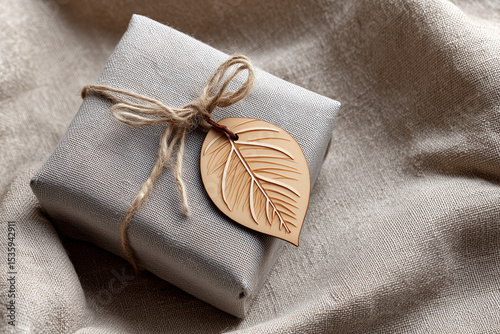gift, present, wrapped, linen, elegant, fabric, box, leaf, wooden, tags, ribbon, neutral, environmentally friendly, minimal, rustic, hand-made, cardboard box, closeup, still life