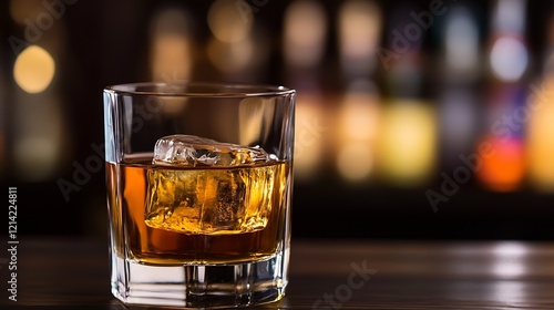 Elegant glass of whiskey with ice cubes against a blurred bar background : Generative AI