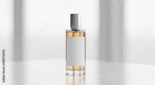 Elegant glass perfume bottle with a blank label for branding. Luxury fragrance product mockup on a bright, reflective background.