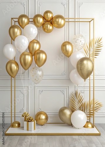 Elegant Gold And White Balloons Celebrate A Joyous Occasion In A Chic, Modern Setting With A Gold Frame And Soft Lighting