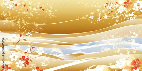 gold, white, flower, floral, red, abstract, wave, background, pattern, design, elegant, texture, illustration, art, graphic, wallpaper, festive, celebration, shimmer, sparkle, luxury, beauty, nature, serenity, japanese, asian, style, spring, blossom