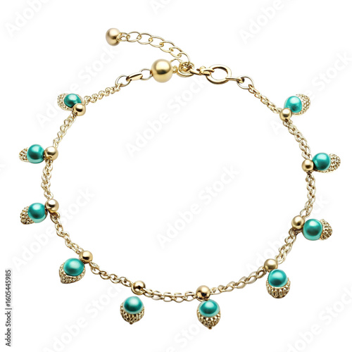 Elegant gold chain anklet adorned with teal gemstone charms and small gold beads isolated on transparent background