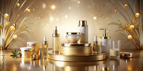 Elegant gold cosmetic pedestal with ornate details and soft lighting in a serene environment, surrounded by luxurious skincare products and fragrances , serene, gold