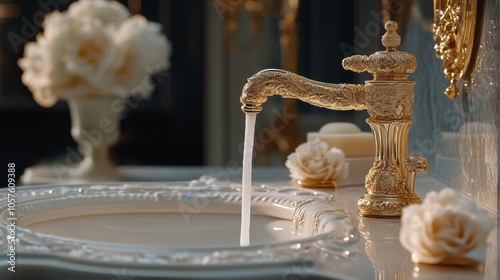 luxury, faucet, sink, water, gold, flower, bathroom, design, interior, elegance, decor, relaxation, artistry, soft light, morning, opulence, home, modern, ornate, craftsmanship, beauty, peaceful, aesthetic, washbasin, vintage, classic, chic, tranquil, ambience, stylish, refreshing, warmth, accessory, lifestyle, comfort, clean, soothing, creative