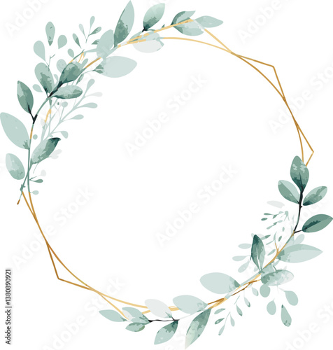 watercolor, chaplet, eucalyptus, leaf, greenery, gold, geometric, frame, design, elegant, minimal, invitation, logotype, decorative, element, botanical, foliage, plant, floral, wedding, marriage, event, celebration, border, template, clip art, graphic, illustration, art, nature, green, teal, blue, white, background, shape, circle, polygon, line, style, aesthetic, vintage, modern, simple, pretty, beauty, luxury
