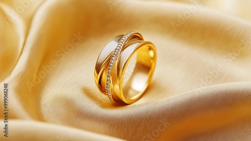 Elegant gold ring with diamond accents on a soft yellow satin background.