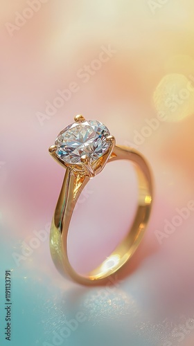 Elegant Gold Ring with Sparkling Round Diamond on Colorful Background