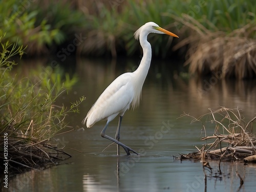 Elegant Great Egret Standing in Serene Wetland Habitat by Shallow Water