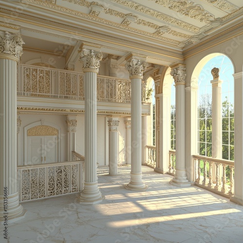 architecture, building, interior, design, classical, greek, roman, column, pillar, marble, white, gold, ornate, hallway, grand, palace, luxury, elegant, sunlight, window, arch, balustrade, detail, texture, light, shadow, roomy, room, interior design, home decor, historical, heritage, antique, majestic, grandeur