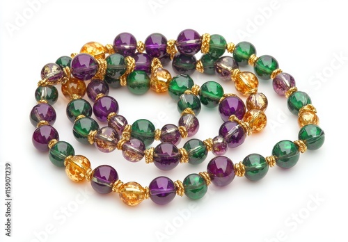 Elegant handcrafted necklace featuring vibrant beads in purple, green, and gold, perfect for adding a touch of sophistication to any outfit or occasion