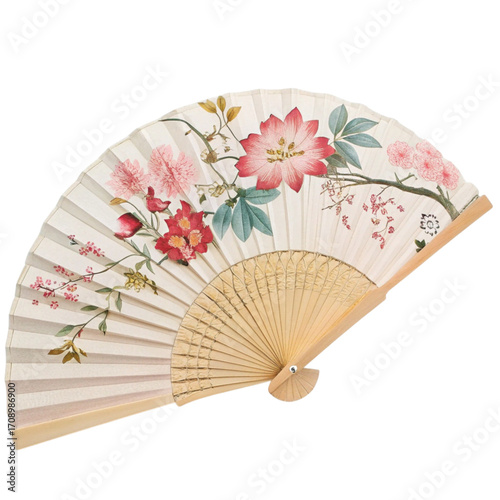 Elegant handheld fan with a traditional Asian floral painting of pink and red blossoms on a white background, isolated