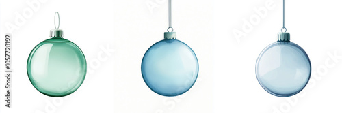 Elegant hanging ornaments in green, blue, and clear on a white isolated background.