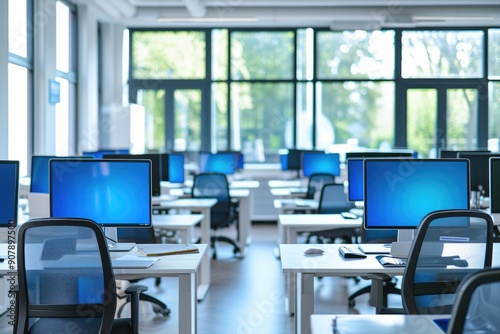 high technology, corporate, office, minimalist, design, roomy, organised, clean, line, monochromatic, colours, scheme, computer, sleek, adjustable, blue, screen, modern, technology, workspace, professional, elegance, efficiency, contemporary, aesthetic, chic, functional, dynamic, digital, stylish, innovative, creative, luxury, pristine, smart, futuristic, neat, polished