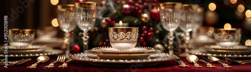 Elegant holiday table setting with beautiful china, crystal glassware, and festive decorations glowing in warm light.