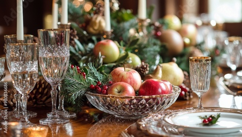 holiday, table, setting, fruit, greenery, candle, crystal, glassware, red, apple, green, dinner, festive, decoration, dining, warmth, celebration, cosy, home, interior, elegant, centrepiece, pine cone, decor, family, gathering, winter, seasonal, dinnerware, ambience, luxury, occasion, glasses, party, meal, feast, joy, festivity, christmas, tablecloth, colours, fresh, harvest