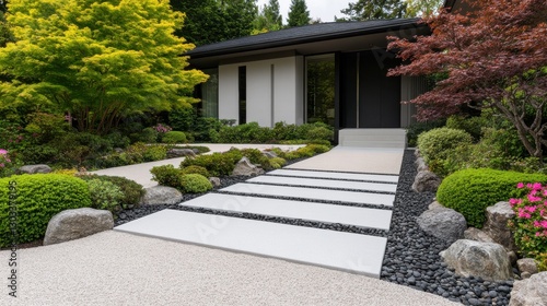 landscaping, driveway, paseo, japanese, zen, pathway, stone, contemporary, gravel, residential, architecture, manicured, path, stone, design, house, stepping, front yard, decorative, modern, serene, rock, shrub, peaceful, tranquil, inviting, entrance, plant, home, clean, beautiful, style, minimalism, outdoors, landscape, tree, beauty, with, green, aesthetic, foliage, natural, lush, elegant, light, facades, daylight