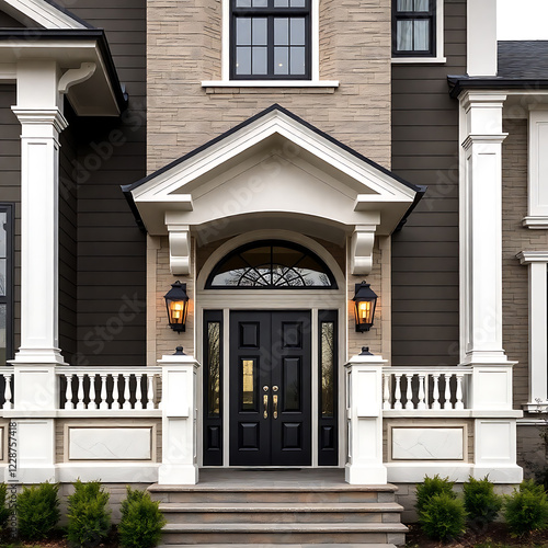 Elegant Home Exterior: Modern Architecture and Classic Design. Luxury Real Estate with Grand Entrance and Stone Facade