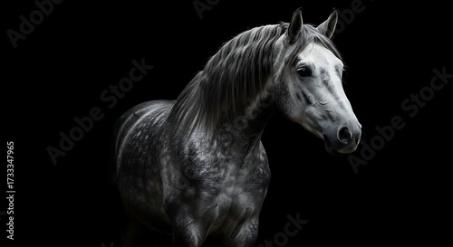 horse, animal, mammal, equine, portrait, black, white, greyscale, elegant, beauty, grace, strength, studio, isolated, dark, background, texture, detail, fur, mane, head, shoulder, powerful, domestic, wildlife, nature, art, design, visual, creative, composition, photo, image, copy space, commercial