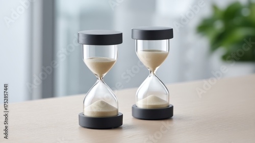 Elegant hourglass sand timers on a minimalist wooden table with a soft focus background highlighting indoor greenery and natural light