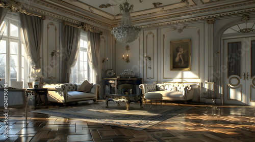 Elegant interior of a luxurious living room with ornate decor, sunlight streaming through windows