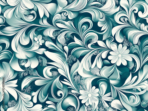 floral, leaf, swirl, teal, cream, baroque, seamless, pattern, intricate, elegant, texture, luxurious, design, detailed, ornate, decorative, classic, refined, rich, vintage, opulent, artistic, stylised, tile, curving, natural, botanical, dark, bold, dynamic, contrast, flowing, rhythmic, sophisticated, traditional, abstract, lavish, scrolling, filigree, timeless, elaborate, fancy, complex, heritage