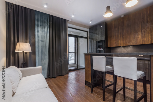 Elegant kitchen interior design. Grey furniture decorated with dark wood panels. White sofa, small balcony.
