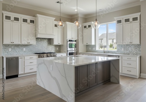 kitchen, cabinet, island, countertop, white, grey, marble, quartz, backsplash, tile, flooring, hardwood, stainless steel, appliance, oven, range, microwave, dishwasher, sink, faucet, drawer, door, window, lighting, interior design, home decor, modern, contemporary, luxury, elegant, roomy, bright, airy, clean, minimalist, style, architecture, remodelling, renovation, upgrade, improvement, farmhouse, custom, furniture