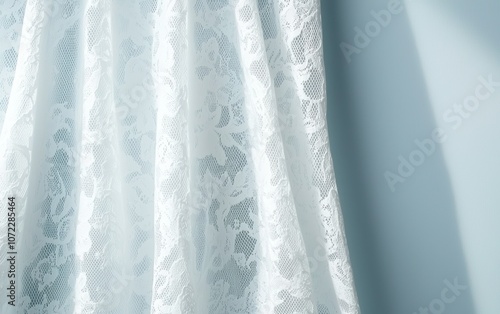 Elegant lace curtain swaying gently in the breeze, sunlight streaming through its intricate details