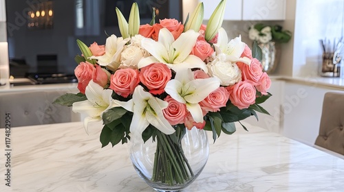 lily, rose, flower, bouquet, vase, glasses, arrangement, elegant, beautiful, pink, white, coral, flower petals, stem, leaf, blossom, floral, design, decoration, home, decor, interior, table, kitchen, modern, luxury, romantic, centrepiece, gift, celebration, spring, summer, nature, beauty, vibrant, delicate, fresh, bright, stunning, gorgeous, impressive