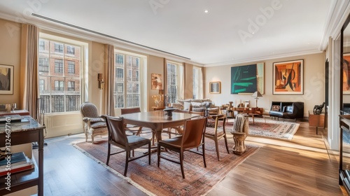 room, interior, dining, living, table, chair, art, decor, window, light, rug, wooden, elegant, modern, design, furniture, home, space, apartment, stylish, framed, painting, wall, view, comfortable, building, natural, vintage, residential, luxury, display, seating, cushion, decorative, open, floor, panel, drape, architectural, artwork, contemporary, square, warm