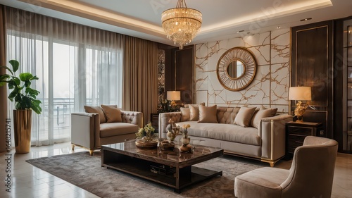 Elegant living room with beige furniture chandelier marble wall and large window with curtains inside