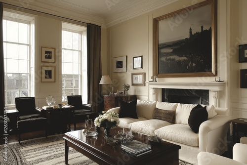 Elegant living room with classic furnishings and large windows offering a bright atmosphere in a historic home