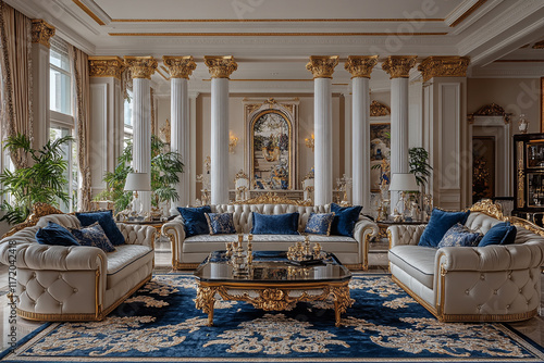 room, living, gold, elegant, classic, furniture, sofa, couch, ornate, pillar, column, luxury, regal, expensive, rich, decor, interior, design, home, house, palace, luxury home, grand, majestic, style, antique, vintage, modern, contemporary, cushion, pillow, blue, cream, beige, table, hot drink, rug, carpet, tapestry, art, painting, lamp, window, curtain, drape