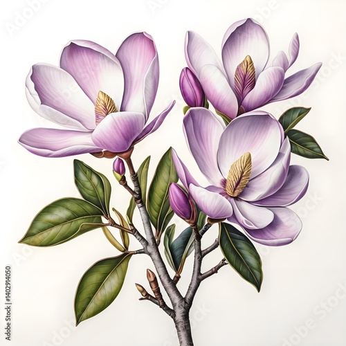 magnolia, flower, flower, blossom, blossom, bloom, bloom, spring, purple, lilac, pink, flower petals, leaf, tree branch, botanical, floral, nature, plant, plant, delicate, elegant, beautiful, pretty, springtime, botany, detailed, closeup, macro, white background