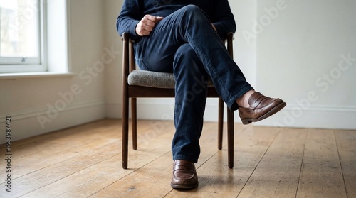 man, sitting, chair, leg, crossed legs, loafers, shoe, wooden chair, relaxing, indoor, daylight, person, foot, trousers, jean, comfort, home, room, furniture, window, wooden floor, casual attire, modern, style, fashion, male, individual, resting, contemplation, serene, tranquil, peaceful, light, natural light, elegant, poise, apparel, footwear, interior, minimal, simple, floor, wall, dark blue, sweater