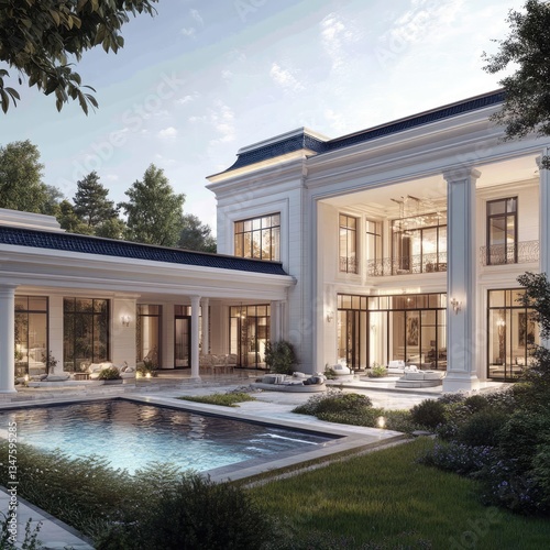 Elegant mansion with pool and gardens at twilight