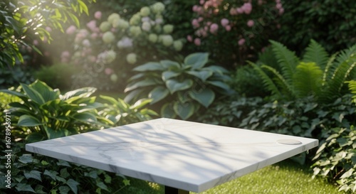 Elegant marble table in a lush garden setting perfect for outdoor dining concept