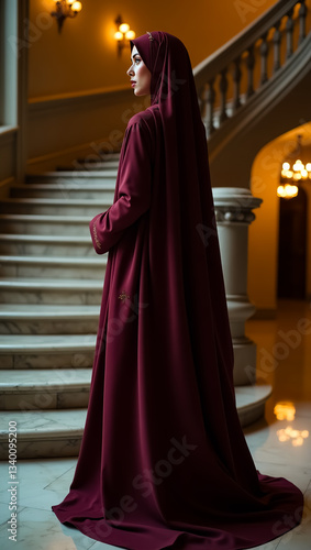 gown, dress, muslim, fashion, elegant, maroon, long, formal, wear, luxury, classic, modern, design, sophisticated, graceful, red, crimson, burgundy, woman, apparel, outfit, style, high, stylish, trendy, clothes, garment, clothing, costume, attire, ensemble, look, image, photo, model
