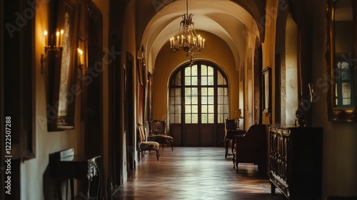 Elegant medieval castle corridor with antique furniture, arched windows, and natural light, blending historic charm with timeless beauty.