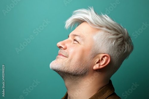 Elegant men's mid fade haircut - midlife white man with white hair. Green solid background. A smiling man in a professional portrait session. Creative artwork of style for aging men.