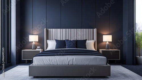 Elegant Modern Bedroom with Dark Blue Walls, Master Bed, and Symmetrical Nightstands Featuring Soft Ambient Lighting for a Cozy and Serene Atmosphere