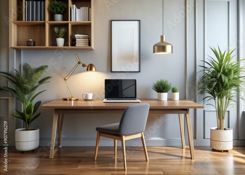 Elegant modern home office featuring sleek desk, laptop, and designer accents, surrounded by minimalistic decor and blank monitor screen, exuding contemporary workspace sophistication.