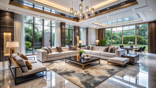 Elegant modern luxury home interior features a spacious living room with sleek furnishings, marble floors, and expansive windows.
