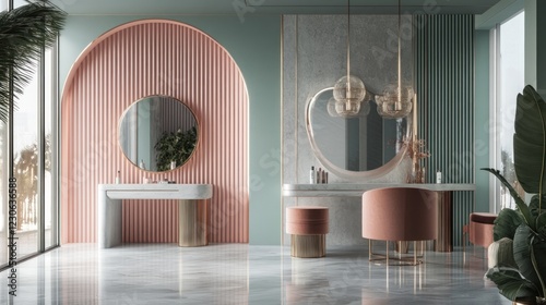 vanity, mirror, marble, pastel, pink, green, gold, modern, design, room, interior, decor, elegant, stylish, luxurious, chair, stool, table, lighting, lamp, contemporary, aesthetic, beauty, make-up, dressing, space, serene, calm, sophisticated, home, apartment, luxury, furniture, brass, arch, wall, floor, plant, tropical